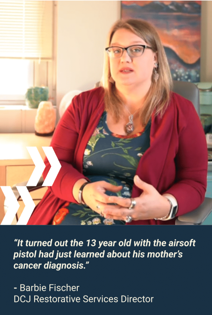 Restorative conferences are an alternative to the legal system. They bring together those harmed (victims) and the individuals who harmed them to find a resolution. “The biggest benefit to our programs is that victims get a voice in the process, they don’t get one in the legal system,” Barbie says. “They actually get to say yes or no–this is what I want to see from this individual.”